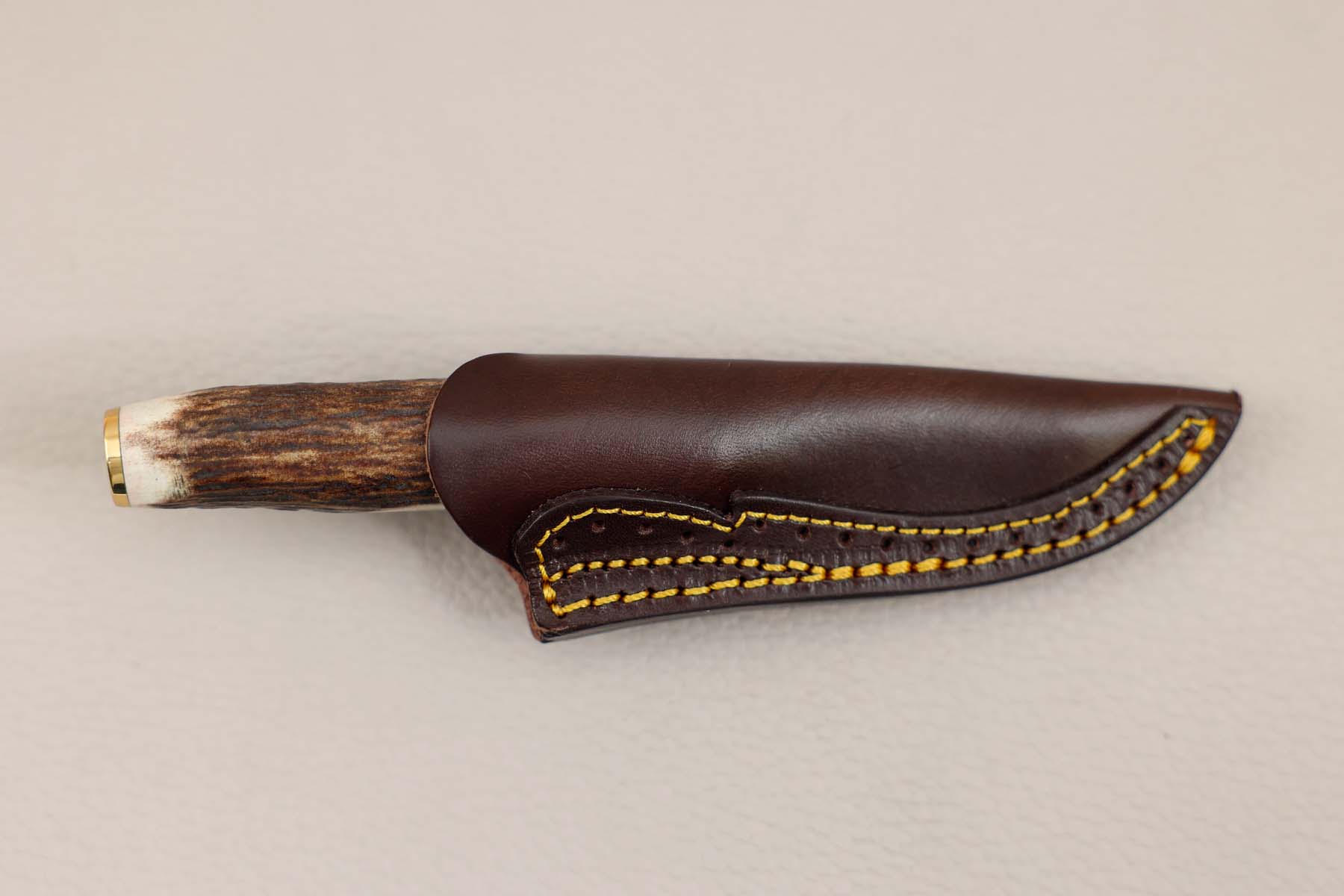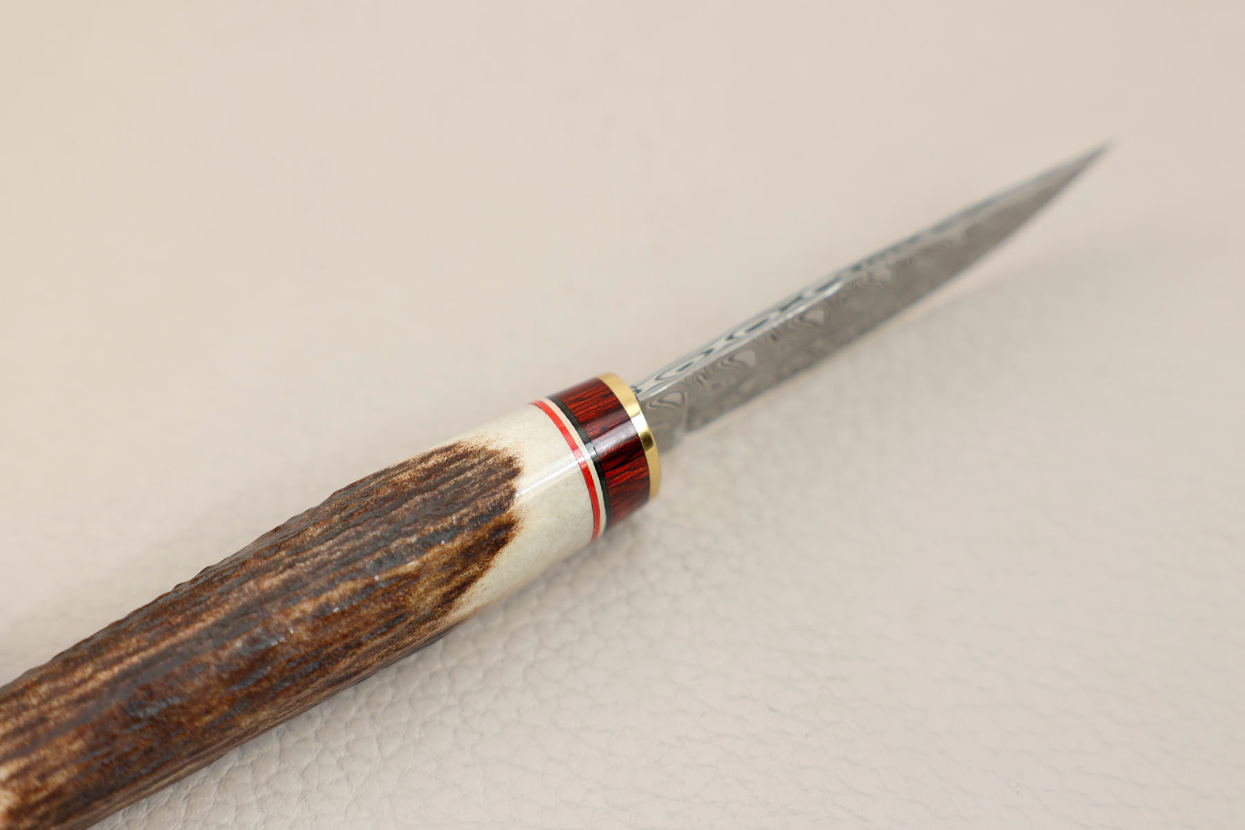 Poignard de chasse bowie de collection de chez Muela avec une lame de 7,5 cm en damas inox composé à partir de 2 nuances d'acier : RWL 34 et PMC 27, un manche en cerf véritable et stamina ainsi que son étui en cuir façon iguane.