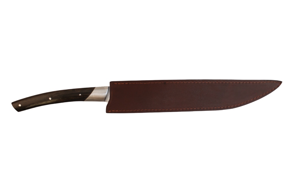 Le couteau flexible filet de sole "Les Grands Gourmets" par Chambriard est livré en coffret, avec une protection de lame en cuir brun.