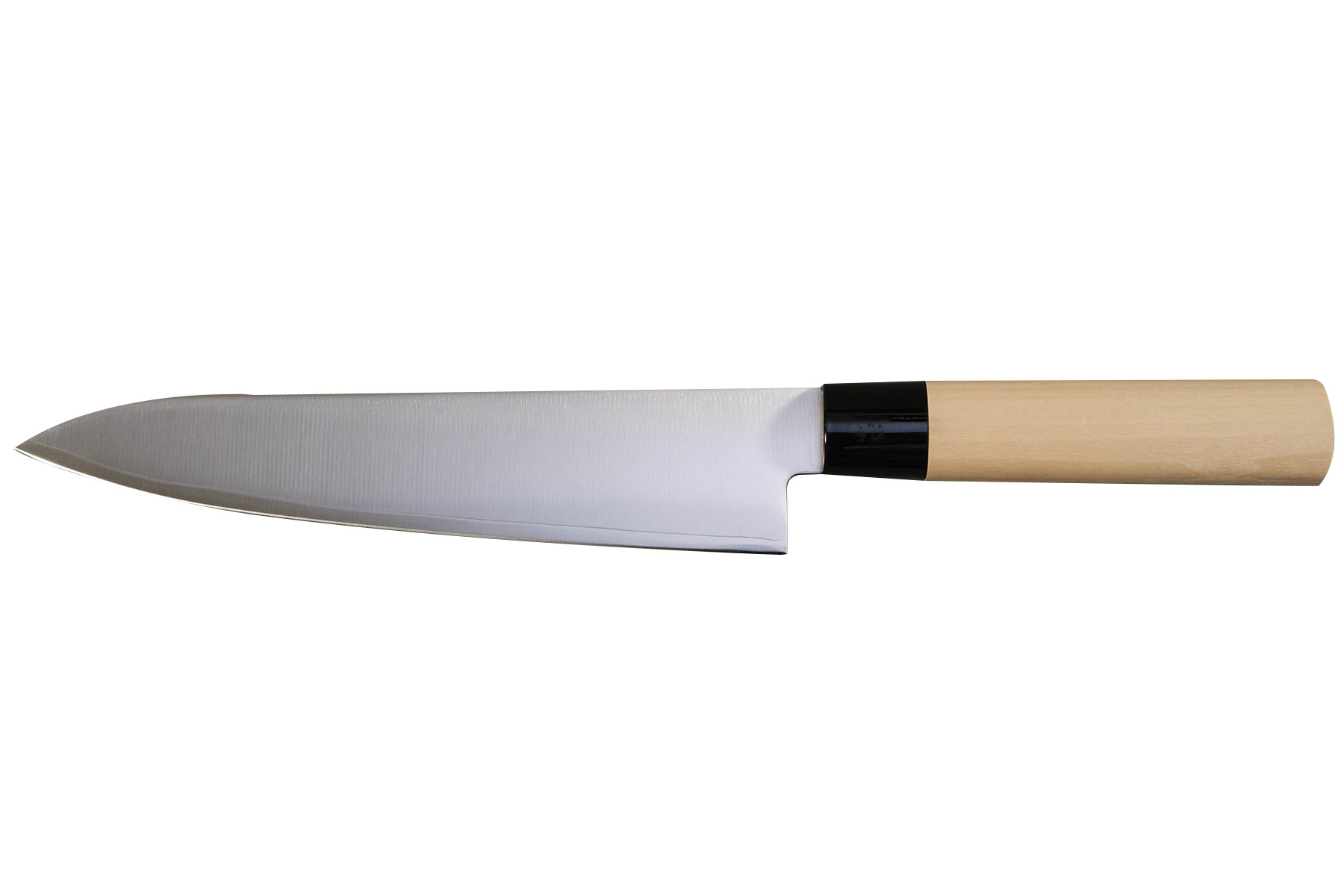 Le fameux couteau de chef, qui est en fait un parfait "polyvalent de cuisine" ; il est un incontournable de la cuisine européenne. Plutôt orienté viande et poisson (le polyvalent japonais "santoku" est plutôt orienté légumes). Disponible en plusieurs tailles de lames, ici en 24 cm.