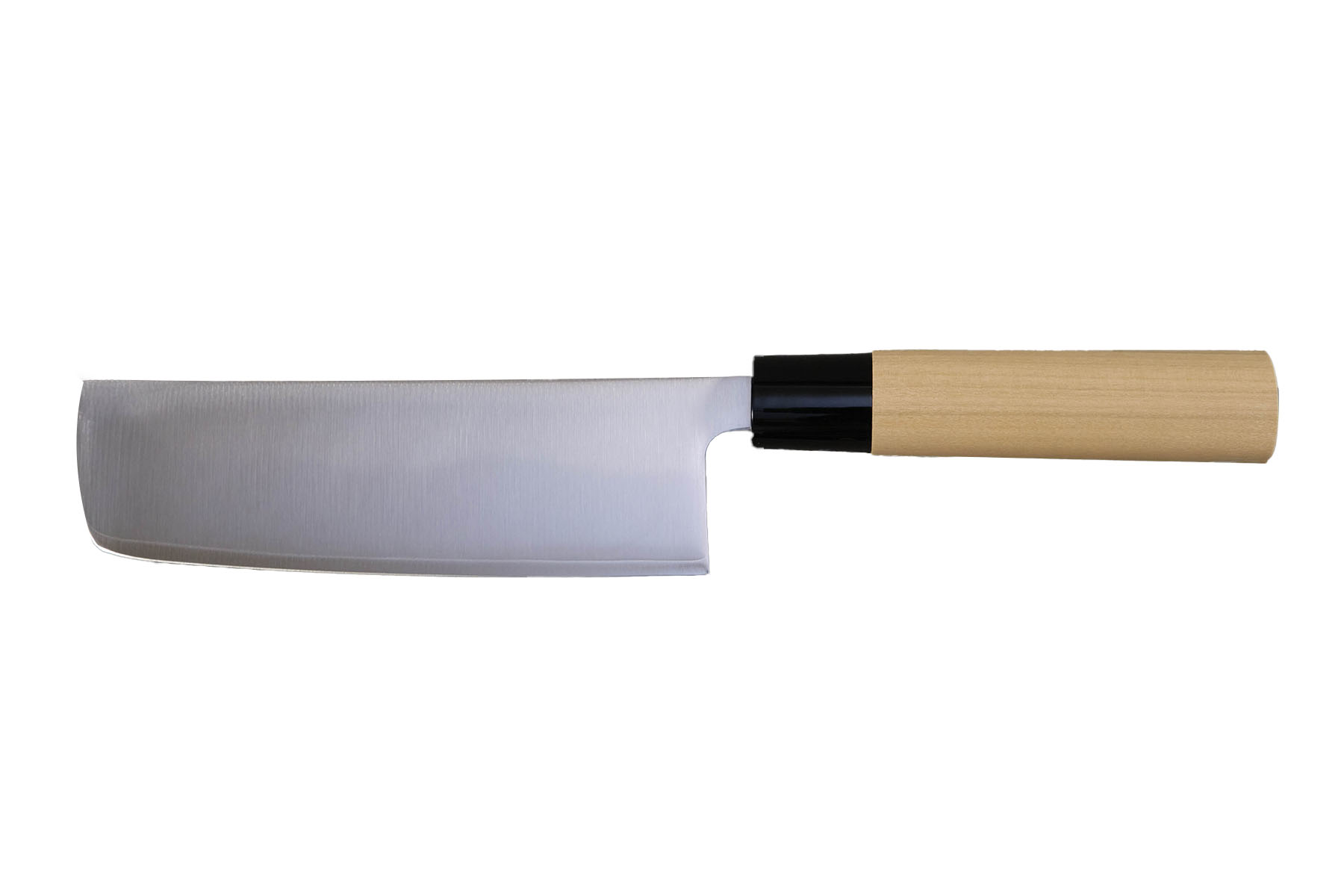 Le couteau à légumes japonais est appelé nakiri, ou usuba en version asymétrique ou bien encore couteau "pelle". C'est le traditionnel couteau à légumes. Sa forme haute en fait un parfait couteau à émincer sur planche, alors que sa forme large sur toute la lame permet de servir de spatule ou de pelle pour transporter les mets finement coupés de la planche à découper vers le récipient de votre choix.