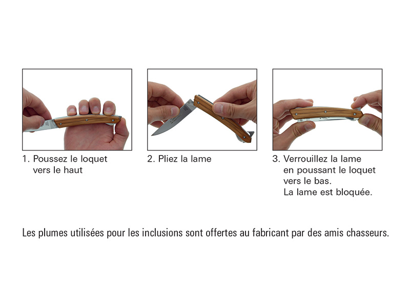 Lame acier X50CrMoV15 brillante (le blocage s'effectue grâce à un loquet de verrouillage situé en bout de manche),