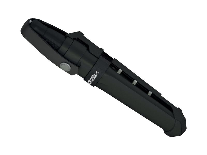 Poignard Mora Garberg de la marque suédoise Morakniv comprenant une lame noire pleine soie en acier carbonne de 11 cm et un manche en gomme noir avec insert nylon noir.