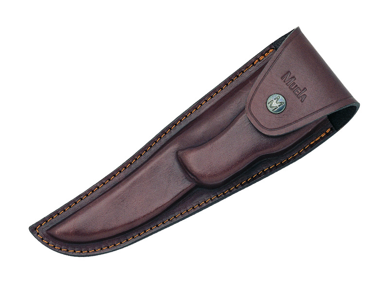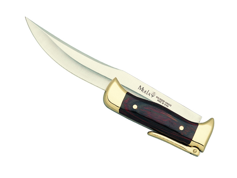 Poignard de chasse pliant dit "à la D'Estaing" de chez Muela avec une lame en acier inox X50CrMoV15 d'une dimension de la lame ouverte de 20 cm et de la lame fermée de 11 cm, ainsi qu'un manche avec des plaquettes en stamina dont l'ouverture et la fermeture sont commandées par le levier.