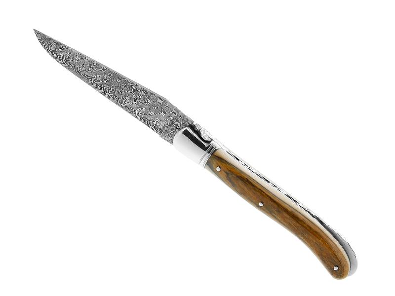 Couteau Laguiole Gilles Fontenille Pataud Gentleman Damas - manche 10,5 cm pointe de corne blondeCouteau Laguiole Gilles Fontenille Pataud Gentleman Damas - manche 10,5 cm pointe de corne blonde