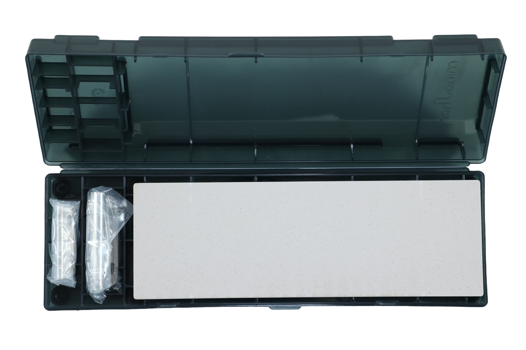 - 1 boîte de rangement qui fait également support pour la pierre pendant l'affûtage.