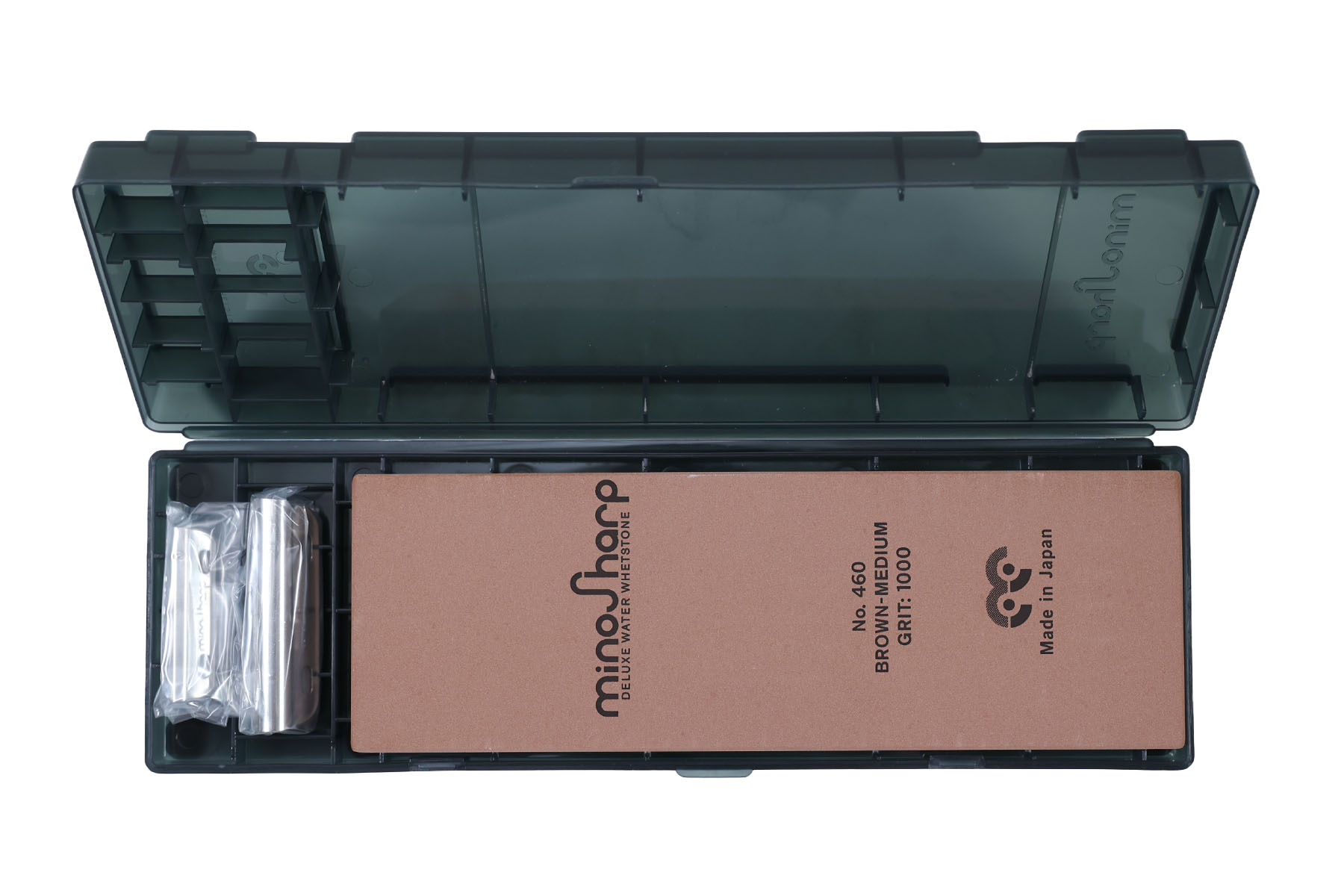 - 1 boîte de rangement qui fait également support pour la pierre pendant l'affûtage.