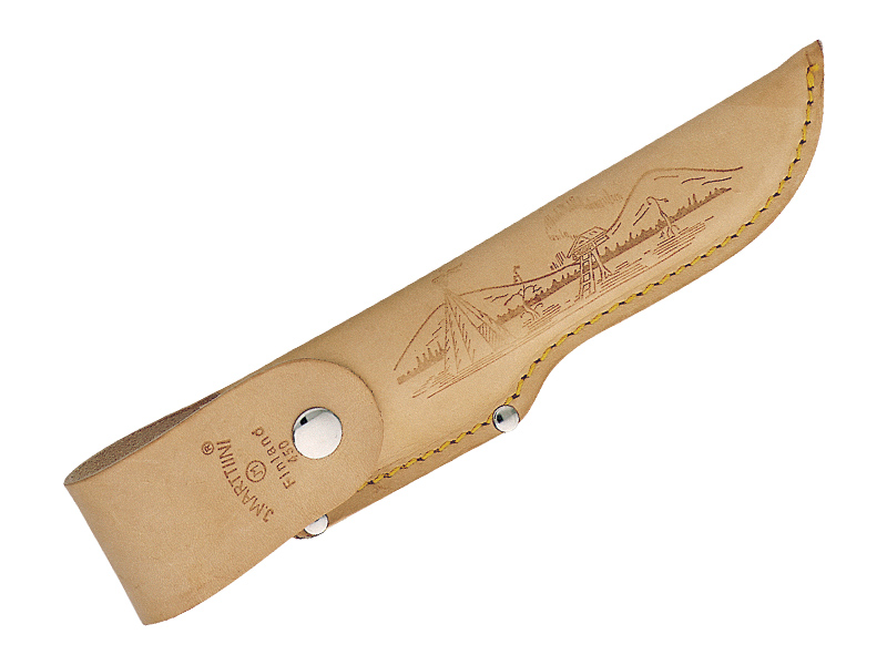 Poignard de chasse de la marque finlandaise Marttiini avec une lame de 11 cm en inox, un manche en bouleau et une garde gravée.