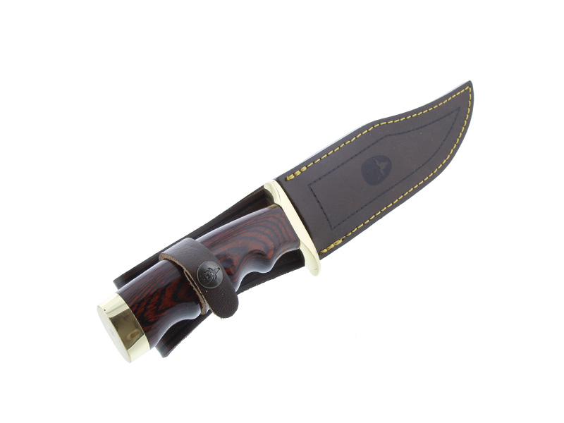 Poignard de chasse Bufalo de chez Muela avec une lame de 17 cm en acier inox X50Cr15MoV, un manche en stamina rouge et une monture en laiton.