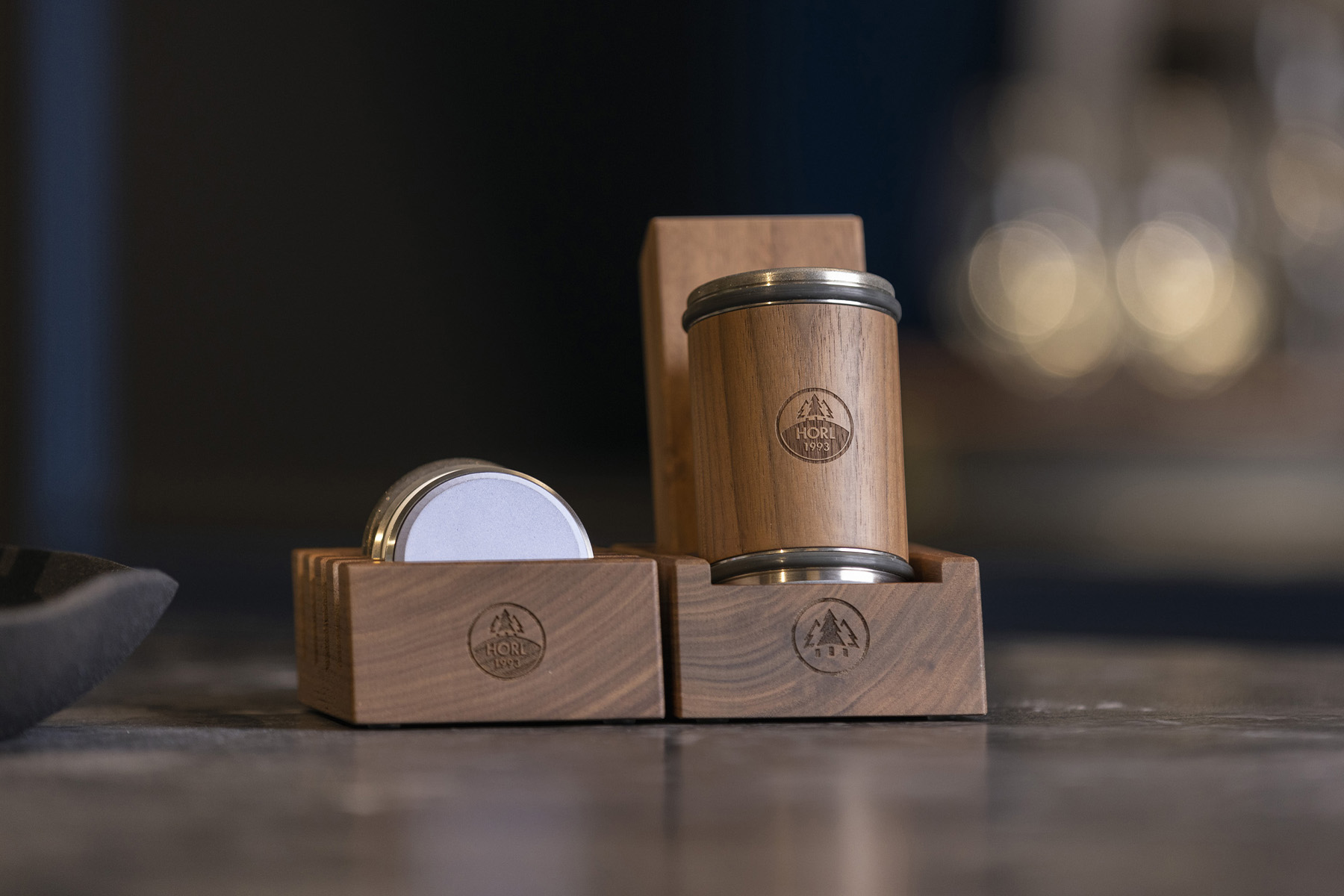 La station de rangement Horl en noyer est livrée sans disque d'affûtage Horl.