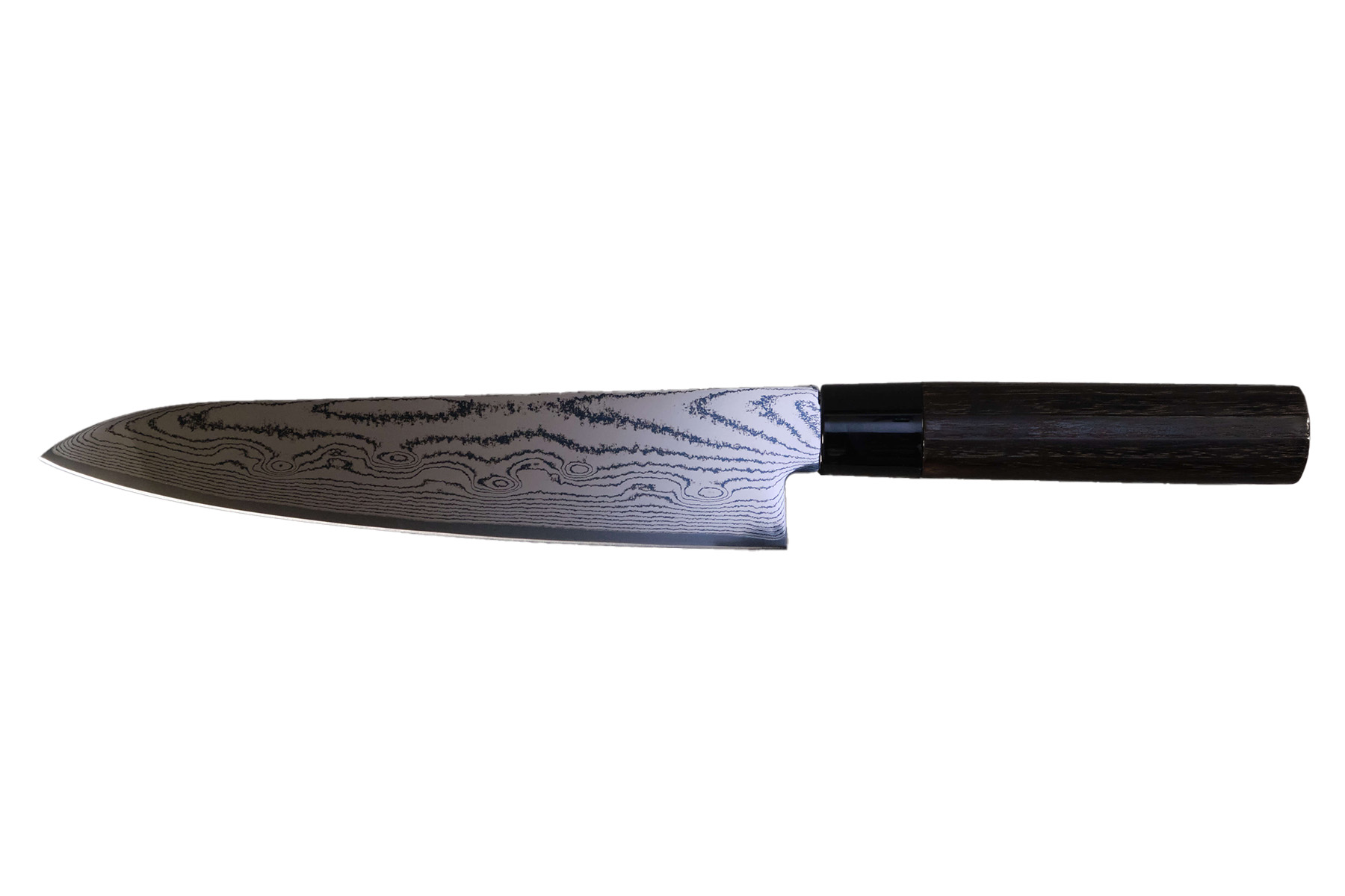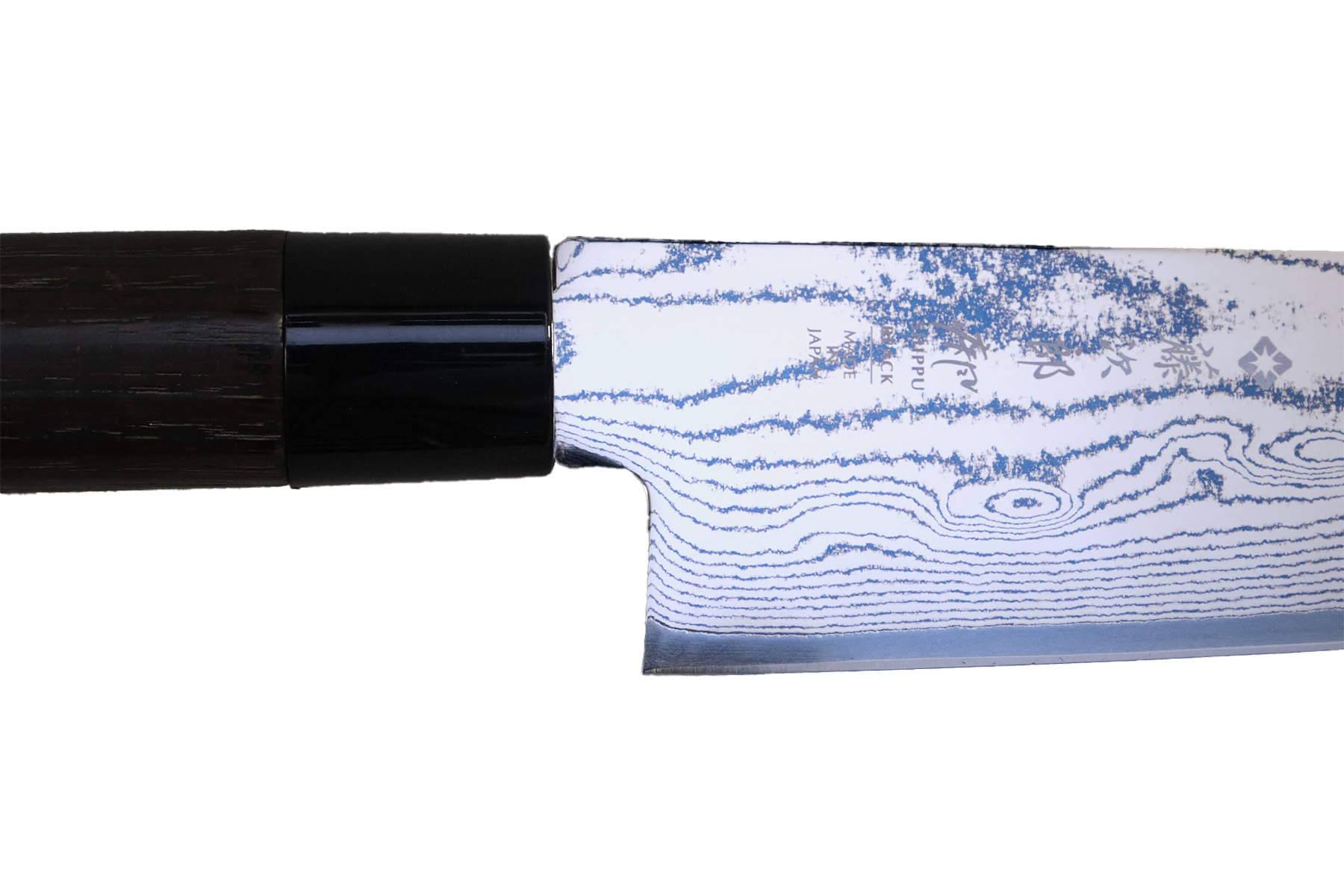 Voici le fameux couteau de chef japonais présenté ici avec une lame de 24 cm. Ce modèle de couteau de chef provient de la gamme Shippu Black de Tojiro, fabricant de renom au Japon.
